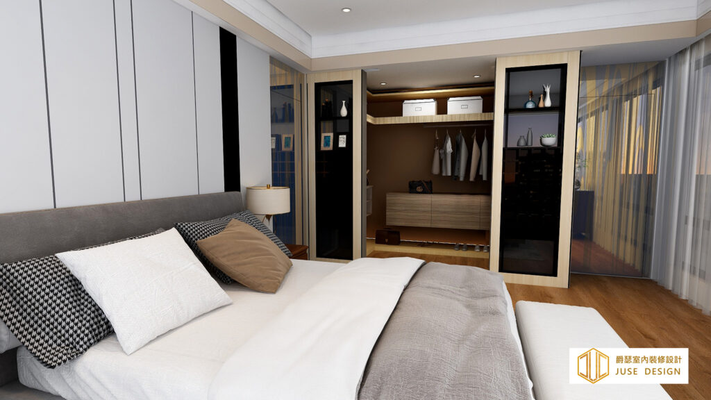 主臥中包括更衣室空間,以兩個空間以拉門區隔,開窗面以米灰色系窗簾、紗簾,牆面背板灰白色塗裝板以不同寬度拼貼,使背牆線條具變化性。