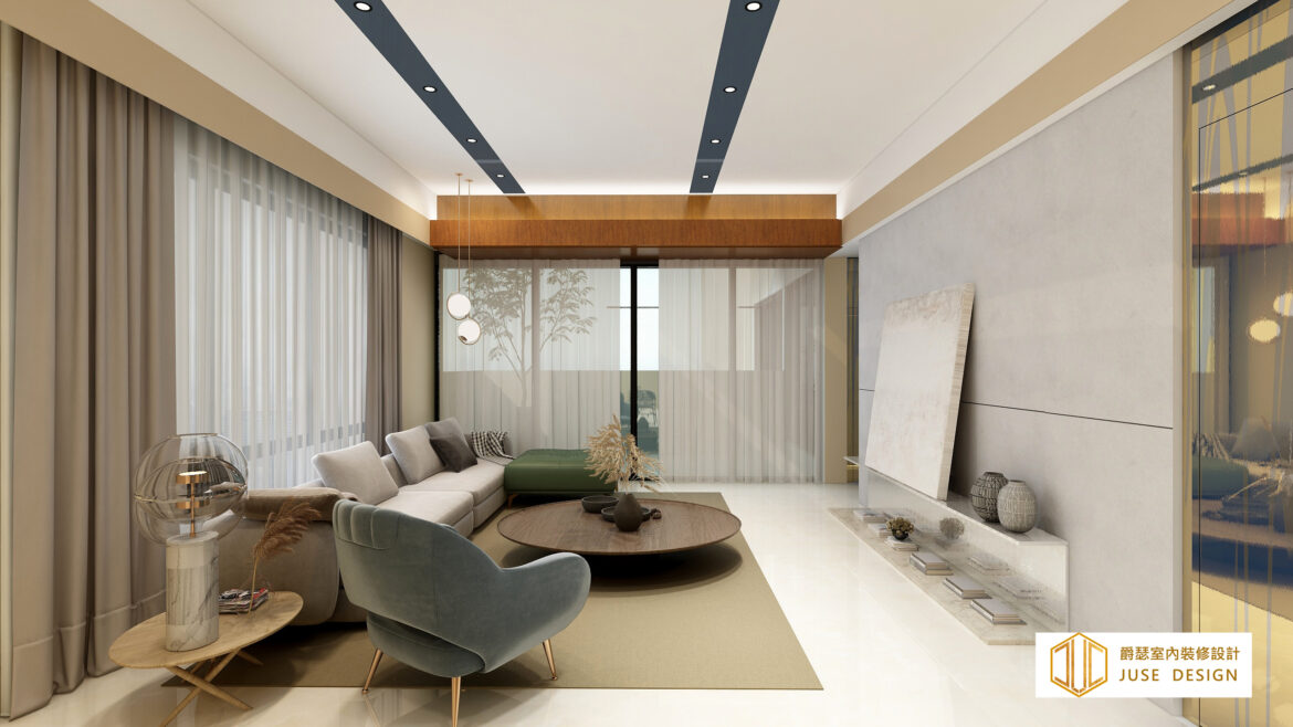 客廳電視牆以仿清水模的表面材,兩側則使用鏡面材質,讓空間表情多一點變化,而鏡面也有讓空間有較放大的效果。而大面落地窗是本戶特色,而使用二層窗簾,紗簾在陽光不強烈時使用,除了有隱蔽性外,讓戶外也有若隱若現的效果,而在遮光簾我們使用顏色則作大地色系,與地毯的顏色來作整體搭配。